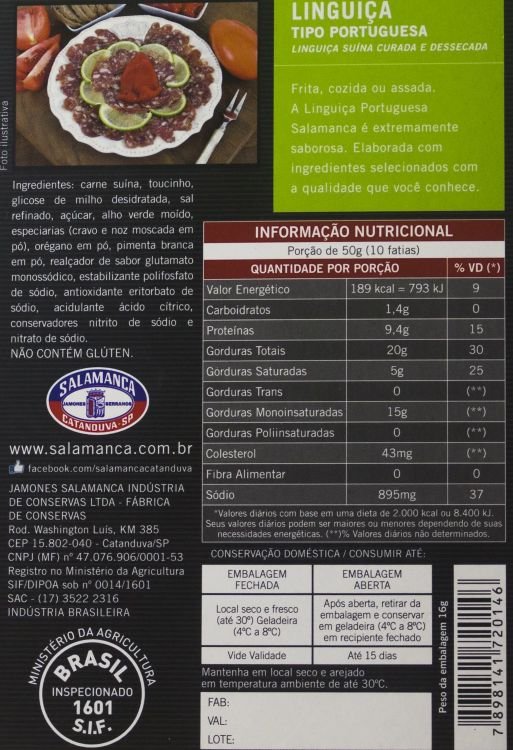 A Linguiça Portuguesa Salamanca é um embutido produzido com carnes suínas e temperos como alho e especiarias, que conferem um sabor marcante, inspirado na charcutaria tradicional ibérica e usada em receitas como feijoada ou como aperitivo. Sua composição inclui carne suína e temperos típicos portugueses resultando num sabor autêntico.